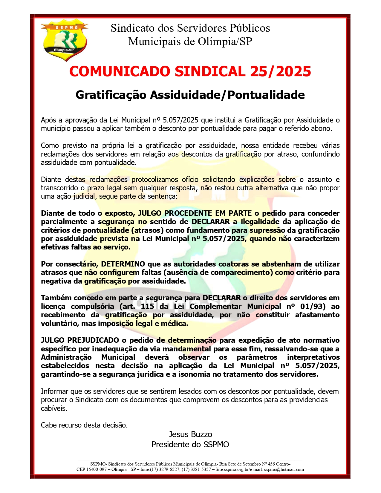 COMUNICADO 25 DE 2025 - Sindicato dos Servidores Públicos Municipais de Olímpia-SP